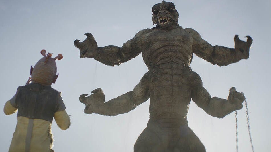 One is a rebirth, of sorts, as we see Temuera Morrison reenact Dances With Wolves among a tribe of Sand People. In this first episode, he’s stripped of his armor by Jawas, dragged into the desert, chained up and forced to dig for black melons, which are basically Tatooine’s natural water bottle. He attempts escape, but doesn’t earn the Tusken’s respect until he kills … I mean…this thing.